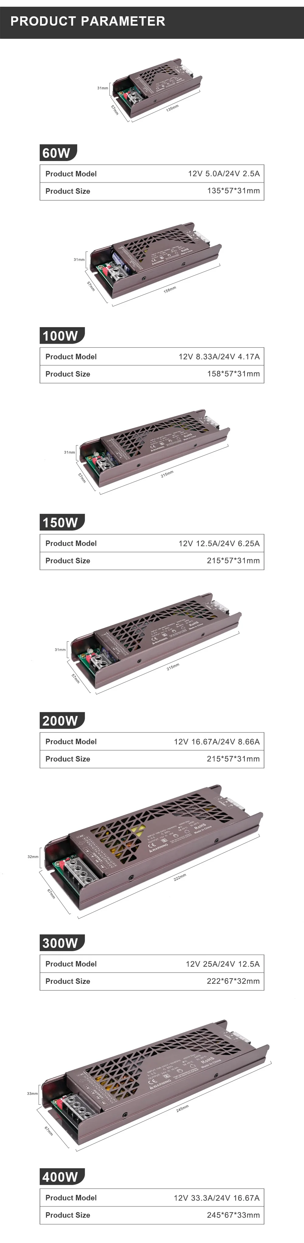 Adjustable LED Lighting Transformers Ultra Thin Power Supply 60W 100W 150W 200W 300W 400W LED Driver For Strip Light DC12V 24V
