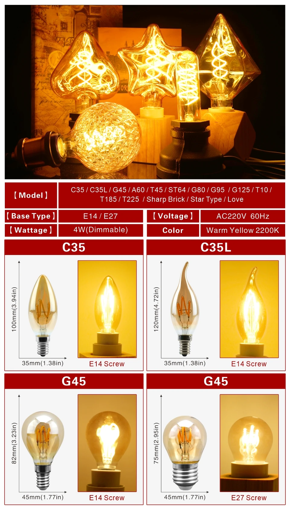 E14 E27 Retro LED Spiral Filament Light Bulb 4W Warm Yellow 220V C35 A60 T45 ST64 T185 T225 G80 G95 G125 Vintage Edison Lamp
