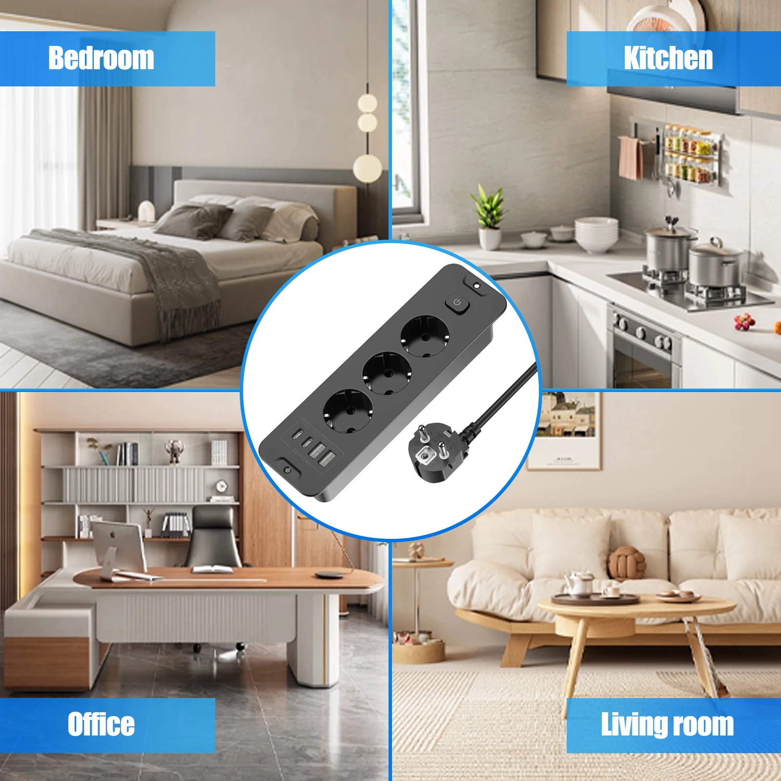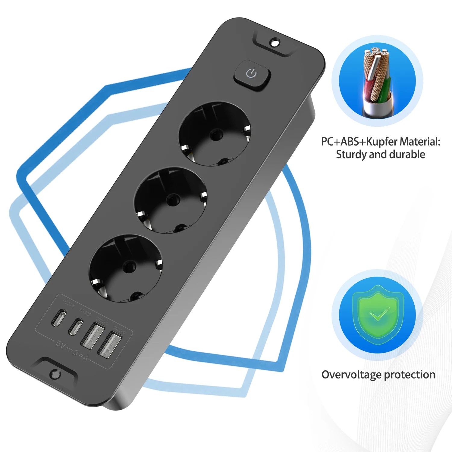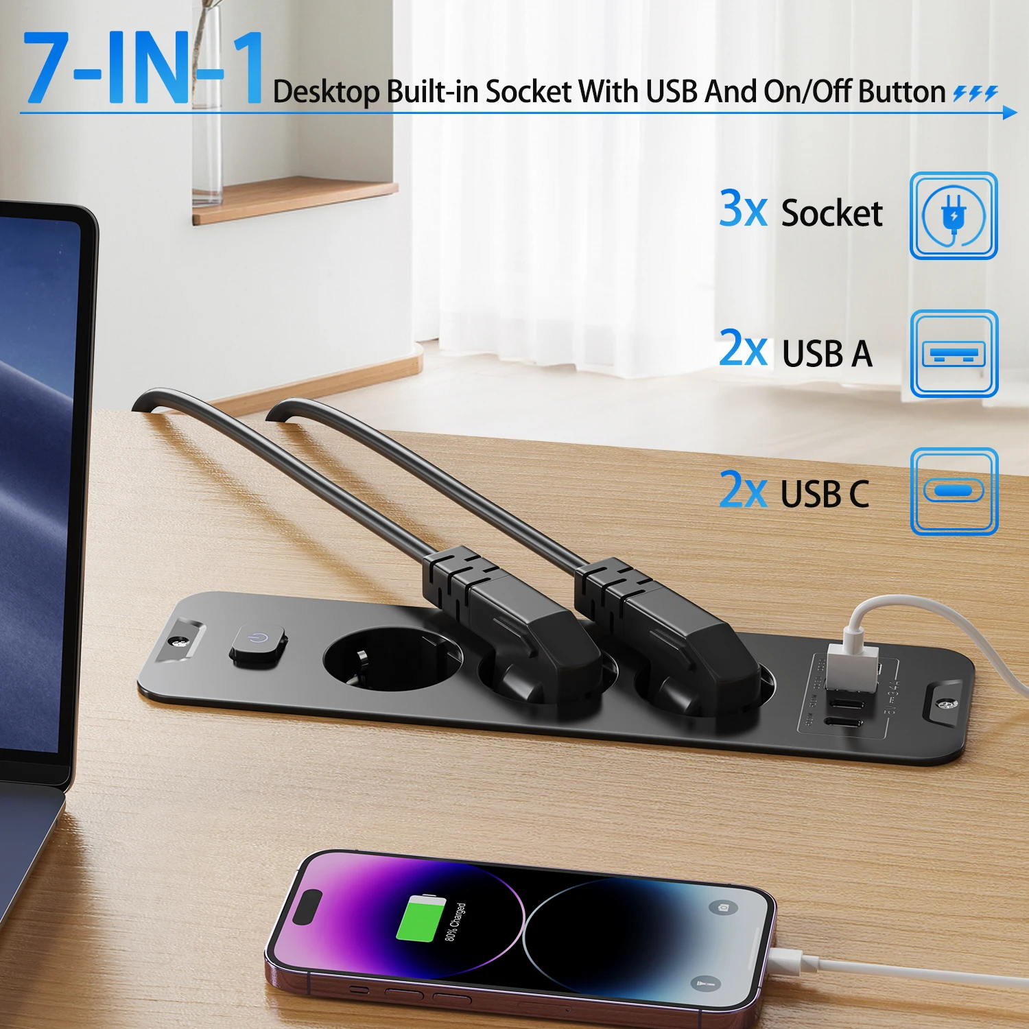 EU Built in Power Strip Desktop Recessed Socket with 2 USB 2 Type C Fast charge, Multi-Contact Outlet with 2M Extension Cable