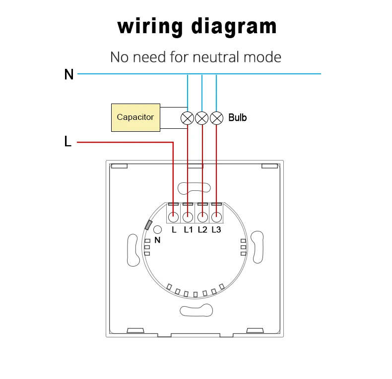 his switch support NO neutral wire required (single Live Wire),Before you buy, please confirm whether your House wiring is No neutral required. So A capacitance is a must to be connected to both ends of the bulbs for normal work.