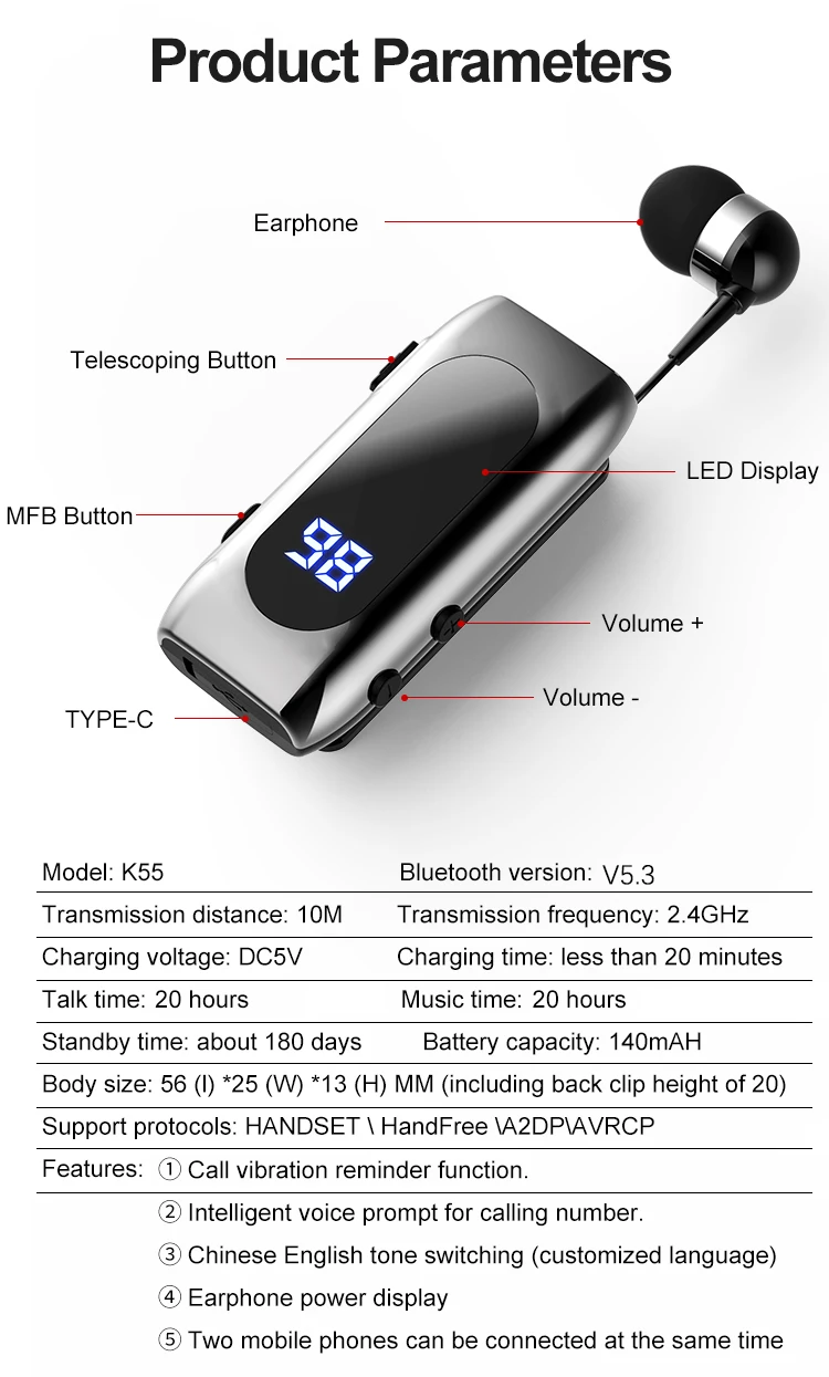 New K88 Lavalier Business Headset Bluetooth 5.4 Bass Earphone Call Vibration Reminder+Voice Number Reporting Wireless Headphone by MVEnergo