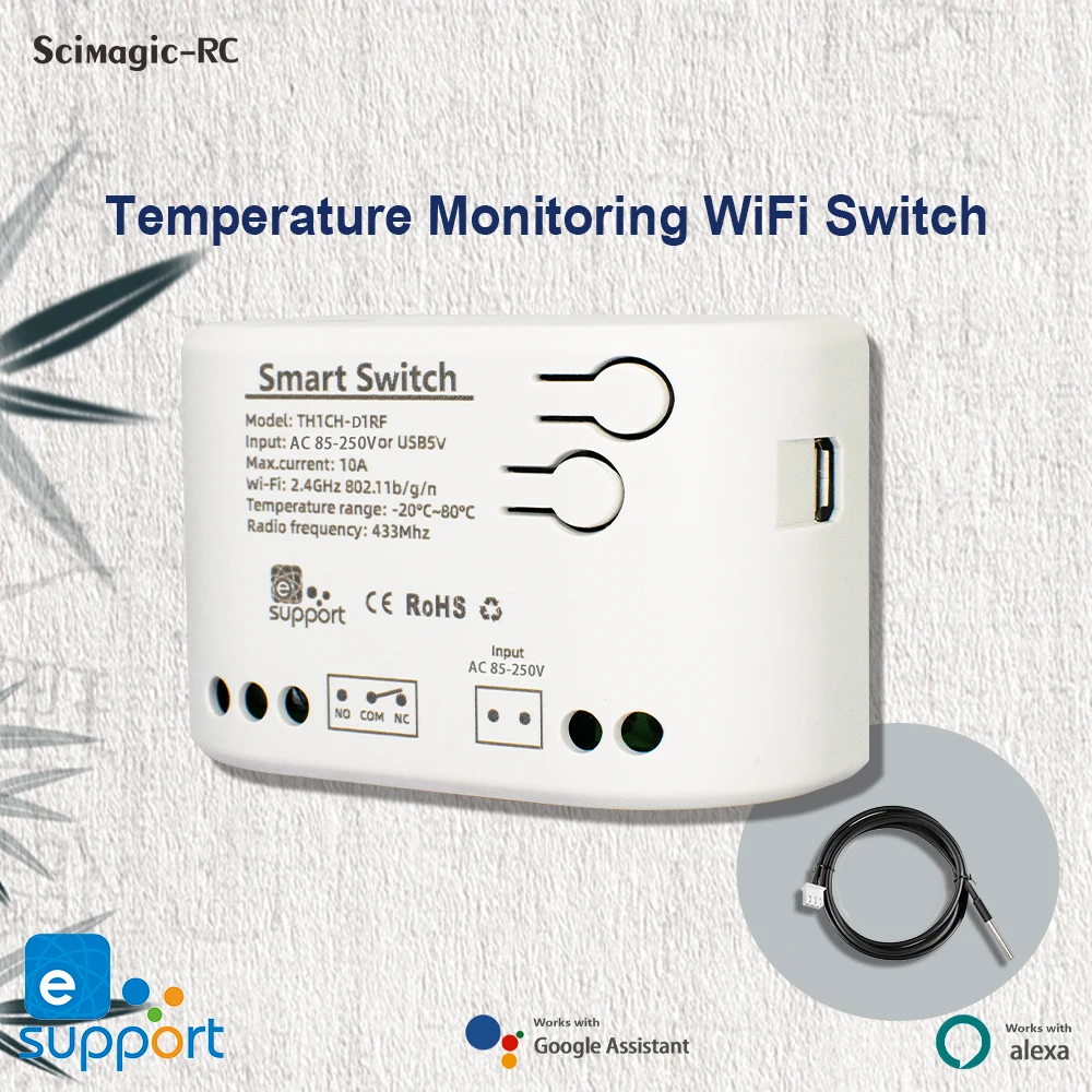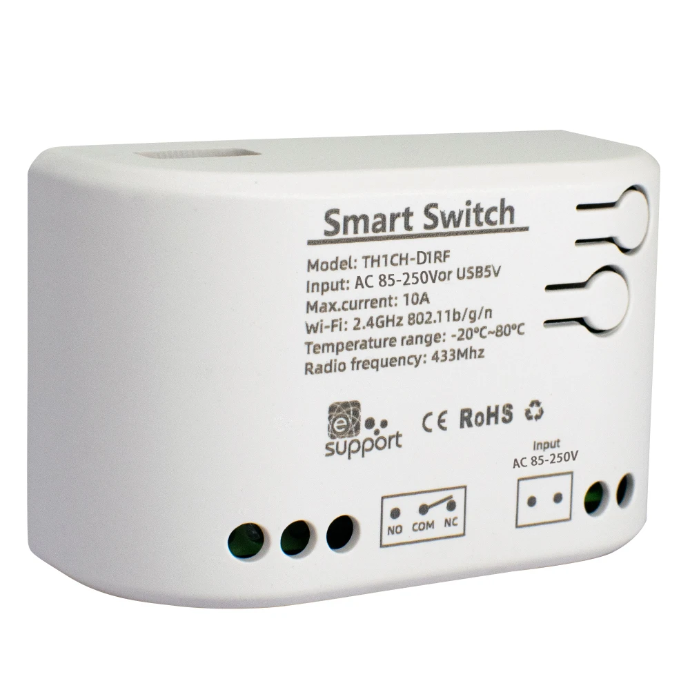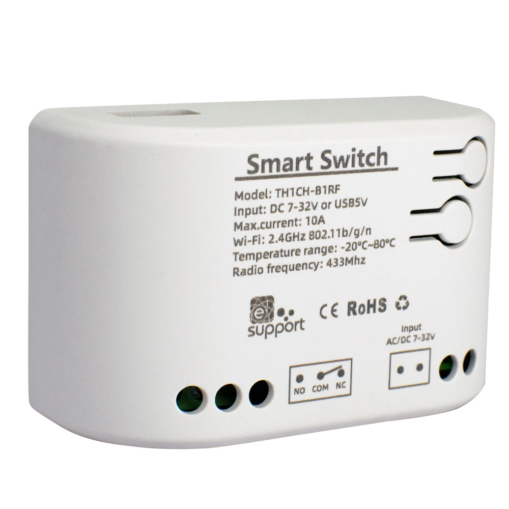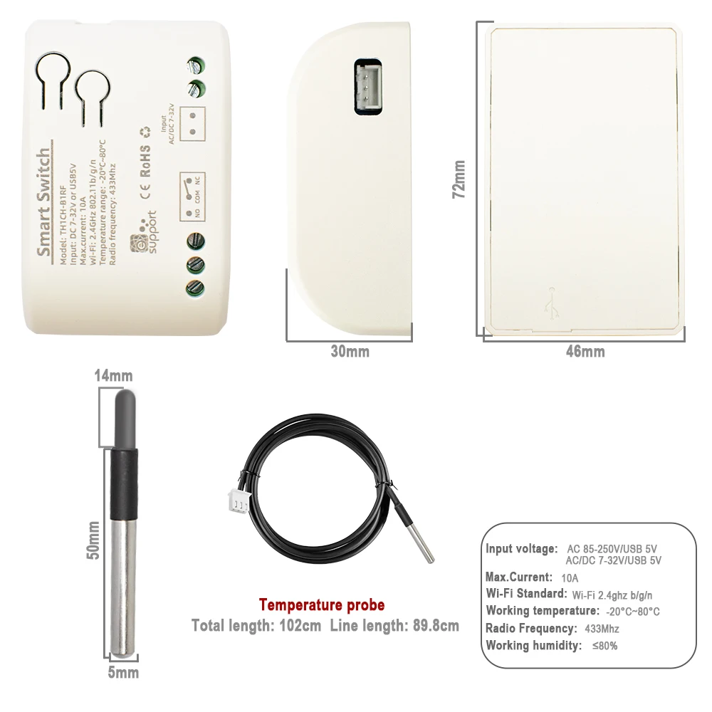 This item is a universal switch for your smart home system to remotely and automatically turn on/off any appliances by phone eWelink APP. When the temperature of the environment falls within the range, it will automatically turn on or off the connected devices. It also supports timing turning on/off the appliances and supports presetting the range for temperature.